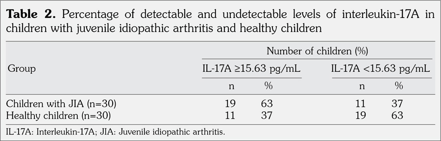 Patients and methods: The study included 30 children (7 boys, 23 girls; mean age 8.8±5.3 years; range 1 to 18 years), who had been diagnosed with JIA (18 children were diagnosed during the study period and 12 children were diagnosed before the start of the study) and had active disease during the study period. Control group included 30 healthy, age- and sex- matched children (9 boys, 21 girls; mean age 8.3±4.8 years; range 1 to 18 years). The enzyme-linked immunosorbent assay was used to assess the serum IL-17A levels of children with JIA in the active phase of the disease and control group. Clinical and laboratory features of the disease were evaluated for the children with JIA.