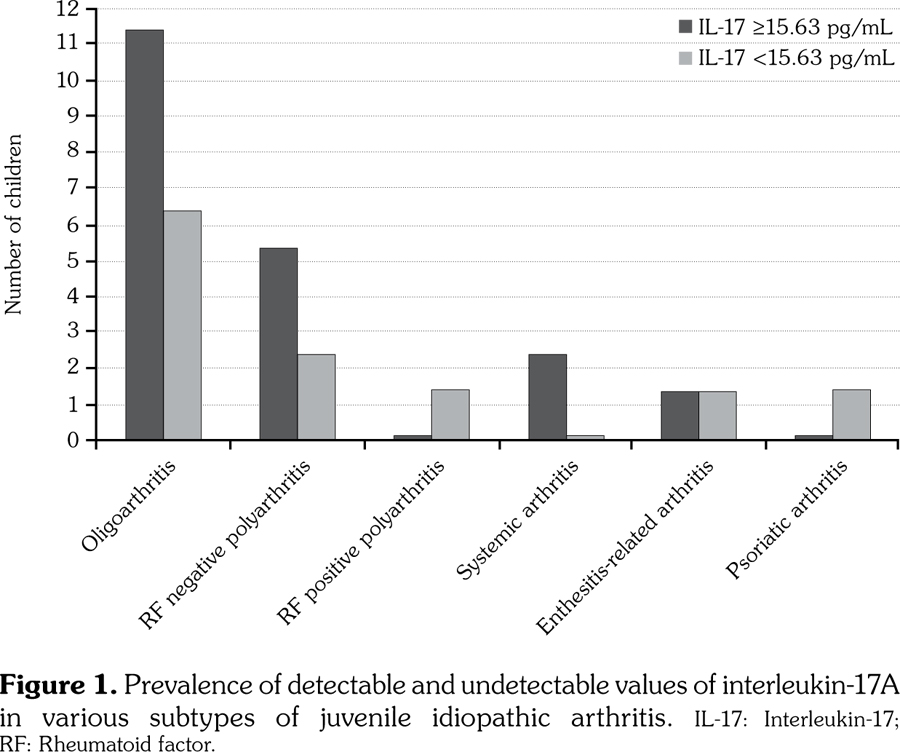 In our study, two children had systemic arthritis in the active phase, and both had detectable IL-17A levels, but this number is insufficient for drawing valid conclusions. One of the crucial mechanisms involved in development of systemic arthritis is the uncontrolled activation of the innate immune response, which results in the release of proinflammatory cytokines such as IL-1, IL-6, IL-18 and proinflammatory S-100 proteins.(31,34) However, a study by British authors confirmed a significant presence of Th17 cells which secrete IL-17A in children with systemic arthritis.(35) In contrast, in two studies that analyzed the levels of IL-17A in children with oligoarthritis, polyarthritis and systemic arthritis, IL-17A levels were not elevated in children with systemic arthritis.(28,30)
