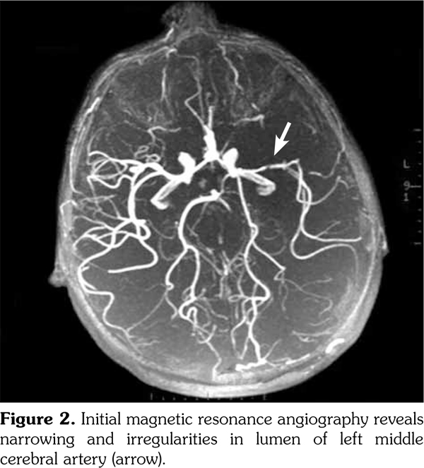 Based on these clinical findings, the patient was diagnosed as HSP, and the skin biopsy showed leukocytoclastic vasculitis with histopathologic evidence of immunoglobulin (Ig) A and M deposition based on direct immunofluorescence staining. A written informed consent was obtained from the parent of patient. The patient was being followed-up as an out-patient. On the 15th day of his follow-up, he admitted to the emergency department by sudden focal tonic- clonic convulsions and unconsciousness. He was not able to use his right hand and foot, also he could not talk. His blood pressure was 105/70 mmHg. Fundoscopic examination was unremarkable. The physical examination showed aphasia, right sided central facial paralysis, and hemiplegia on the right. Deep tendon reflexes were exaggerated and there was extensor plantar response on the right side. Cerebellar functions and sensory testing were normal. In acute laboratory evaluation, serum electrolytes and glucose levels were normal. Immediate 1.5 Tesla magnetic resonance imaging (Magnetom Avanto, Siemens Medical Solutions, Erlangen, Germany) demonstrated multiple, high signal intensity areas on T2-weighted images in both cortical and subcortical areas of the left parietal lobe (Figure 1). Magnetic resonance angiography revealed narrowing and irregularities in the lumen of left middle cerebral artery resembling vasculitis (Figure 2). Electroencephalography showed diffuse generalized delta slow waves of moderate amplitude without epileptiform discharges. Renal angiography and mesenteric vasculature were normal. The patient was diagnosed as cerebral vasculitis due to HSP. Intravenous pulse methylprednisolone (30 mg/kg/day) was given for three consecutive days; subsequently the patient received oral steroids (2 mg/kg/day) for cerebral vasculitis. Because of the unchanged clinical status of the patient, pulse cyclophosphamide therapy was begun. Patient received 500 mg/m(2)/day pulse cyclophosphamide monthly for three months. He showed clinical improvement after cyclophosphamide therapy. The follow-up magnetic resonance angiography, performed 15 days after the initial one, demonstrated substantial improvement of cerebral lesions (Figure 3). His steroid treatment was stopped by tapering within six months. He had speech therapy and also physical rehabilitation and therapy for two years. He has been followed-up without any sequel for four years.