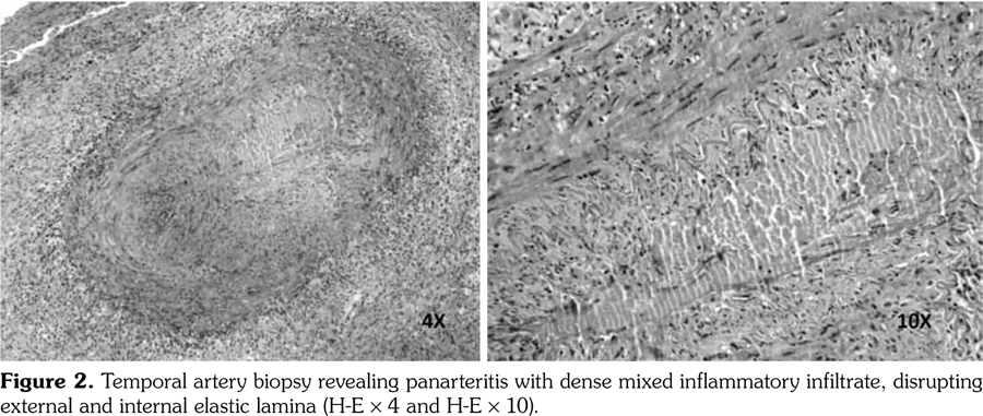 Narváez et al.(2) found peripheral arthritis in eight of their 73 patients (11%) with GCA, which was typically peripheral, distal, asymmetric, non- erosive, and temporary. Orchitis and epididymitis have been reported previously as the sole urological manifestations of GCA.(3) When the disease has atypical presentation, histological analysis of TAB biopsy specimen plays a key role in distinguishing GCA from non-GCA arteritides.(4) The TAB in our patient revealed panarteritis with a predominant lymphocytic and histiocytic infiltrate, which is consistent with the histological pattern of GCA.(5) Absence of significant leukocytoclasis, neutrophil/eosinophil infiltrate and fibrinoid necrosis argues against the alternative etiology such as polyarteritis nodosa and anti-neutrophil cytoplasmic antibodies vasculitis in our patient. Although giant cells were not visualized in the observed biopsy specimen, they are typically observed in only about half of the biopsy positive patients with GCA and are not mandatory for diagnosis.(6)
