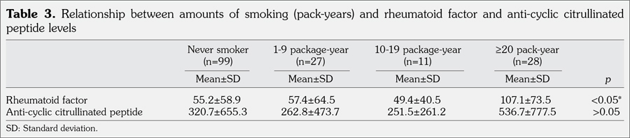 Results: Patients were divided into three groups according to their smoking habits. Ninety-nine patients (60%) were never smokers, 45 patients (27.3%) were long-term smokers and 21 patients (12.7%) were new smokers. Three groups were compared for disease activity. Disease activity score 28 scores were 3.2±1.2, 3.2±1.3, and 3.2±1.4, respectively (p>0.05). The erosion score (2.6±5.8, 7.1±10.9, and 11.1±19.2, respectively) and joint space narrowing score (9.9±7.3, 18.6±14.9, and 17.3±12.3, respectively) according to modified Sharp method were significantly lower in never smokers group than other groups (p<0.05). RF titrations were 55.2±58.9, 60.5±63.1, and 84.9±71.5, respectively, and levels of long-term smokers group were significantly higher than the other groups (p<0.05). Joint space narrowing score was 16.2±11.9 and 6.4±10.4 in RF (+) and RF (-) patients, respectively (p<0.05). There was no significant relationship between anti-cyclic citrullinated peptide levels and others parameters.