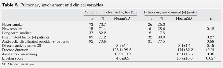 Rheumatoid lung disease was found in 40 out of 165 patients. Parenchymal involvement was detected in 35 patients (21.2%), pleural involvement in one patient (0.6%), and pleural- parenchymal involvement in four patients (2.4%). No significant differences were found between lung involvement groups as regards to smoking, RF/anti-CCP positivity, JSN, and disease activity score 28 values. Mean disease duration was longer and ESs were higher in patients with pulmonary involvement (Table 5).