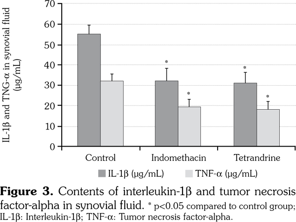 Results: In the tetrandrine group, the pathological changes were more attenuated than in the control group. Levels of interleukin-1 beta, tumor necrosis factor-alpha, nitric oxide and metalloproteinase-3 in the synovial fluid or synovium were all significantly suppressed in the tetrandrine group compared with the control group. There were no significant differences between the tetrandrine and indomethacin groups.