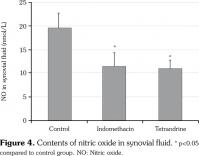 As shown in Figures 3 and 4, the levels of IL-1β, TNF-α and NO in the SF were significantly decreased in the indomethacin and tetrandrine groups compared with the control group (p<0.05), with no significant differences between the indomethacin and tetrandrine groups (p>0.05).