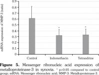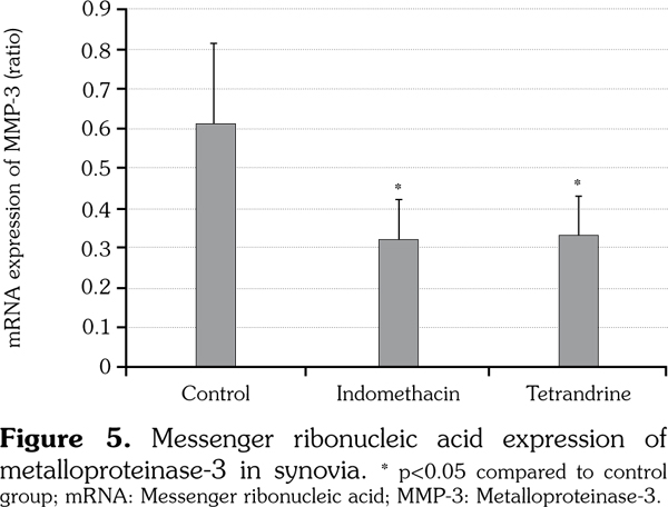 There was a significant decrease in mRNA expression of MMP-3 in the indomethacin and tetrandrine groups compared to the control group (p<0.05). However, there was no significant difference between the indomethacin and tetrandrine groups (p>0.05) (Figure 5).