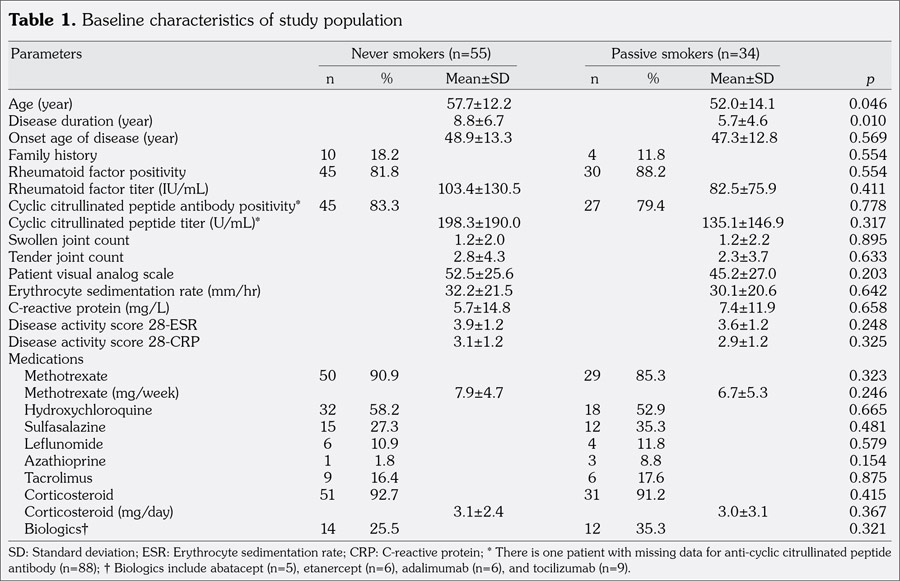 Results: Among the 100 female RA patients analyzed, the distribution of smoking status was as follows: current (n=3), never (n=55), passive (n=34), and ex-smokers (n=8). There was no difference of DAS28-ESR and DAS28-CRP between never and passive smokers at baseline. At the time of follow-up, the values of DAS28-ESR and DAS28-CRP in never smokers were significantly decreased than those in passive smokers (p=0.019 and p=0.023, respectively). Patients who never smoked showed a trend to have good or moderate European League Against Rheumatism response without statistical significance, compared to passive smokers (52.7% vs. 32.4%, respectively; p=0.060).