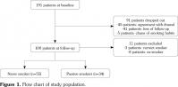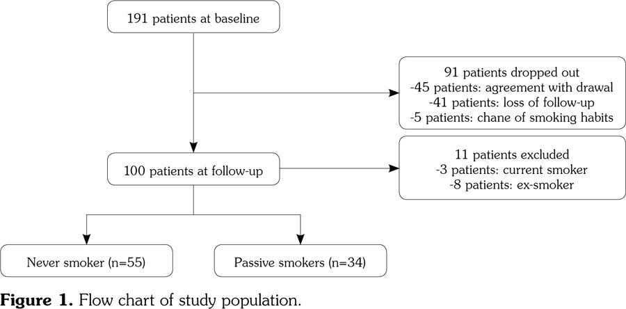 Among the totally enrolled 191 patients, only 100 female RA patients (mean age 56.1±13.4 years; range 21 to 87 years) completed the study. Ninety-one patients dropped out due to withdrawal of agreement (n=45), loss of follow-up (n=41), and change of smoking habits (n=5) (Figure 1). RA patients were classified according to smoking status: current (n=3), never (n=55), passive (n=34), and ex-smoking (n=8). The baseline characteristics of 89 patients with RA were presented in Table 1.