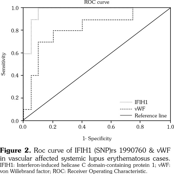 The strong positive relationship of IFIH1 and vWF with both types of vascular affection (arterial and venous) shows that both markers can indicate severe inflammation and ongoing destruction. IFIH1 gene may indicate endothelial dysfunction, increased plasma vWF levels and atherosclerosis in SLE.(6,7) Our study results supported this hypothesis by showing a statistically significant positive correlation between IFIH1 and vWF as a marker of endothelial dysfunction (p=0.001).