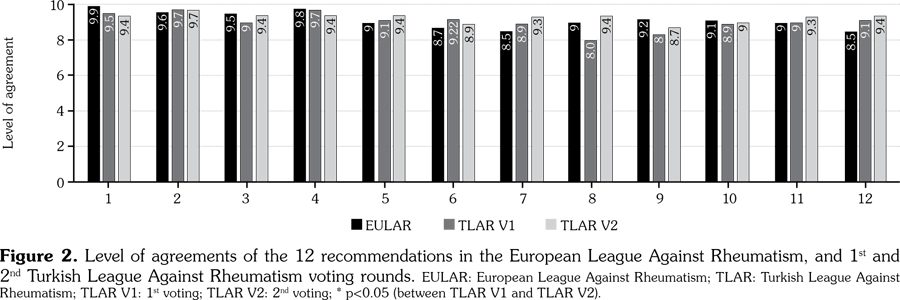 Patients and methods: The EULAR 2016 recommendations for the treatment of RA were voted by 27 specialists experienced in this field with regard to participation rate for each recommendation and significance of items. Afterwards, each recommendation was brought forward for discussion and any alteration gaining ≥70% approval was accepted. Also, Turkish version of each item was rearranged. Last version of the recommendations was then revoted to determine the level of agreement. Levels of agreement of the two voting rounds were compared with Wilcoxon signed-rank test. In case of significant difference, the item with higher level of agreement was accepted. In case of no difference, the changed item was selected.