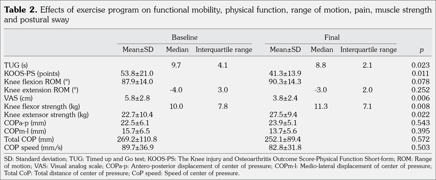 The four-week home-based therapeutic exercise program improved significantly pain intensity, functional mobility, muscle strength, and physical function (Table 2). Three participants reported no changes on pain, while the other nine (75%) had a minimal improvement of ≥1 on VAS. The program did not change body weight (79.9±13.9 to 79.9±14.1 kg, p=0.965), knee range of motion or postural sway (Table 2).