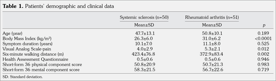 However, patients with RA had higher levels on VAS-pain (5.3±2.1 vs. 4.0±2.9, p=0.012), and higher body mass index (31.0±6.2 vs. 26.3±6.0, p<0.0001) and lower distances in six- minute walking test (372.9±83.4 vs. 423.4±76.8, p=0.002) than patients with SSc (Table 1).