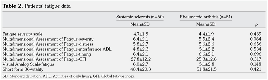 Results: Patients had similar educational and smoking status, as well as functioning and health related quality of life. However, patients with RA declared higher levels on visual analog scale-pain (p=0.012) and higher body mass index than patients with SSc (p<0.0001) and lower distances in six-minute walking test (p=0.002). Levels of fatigue were quite similar between patients with RA and SSc. Levels of fatigue, measured by different scales, were significantly correlated with physical functions and health related quality of life measures and psychometric variables in both groups; however, the correlation coefficients were relatively higher in patients with RA.