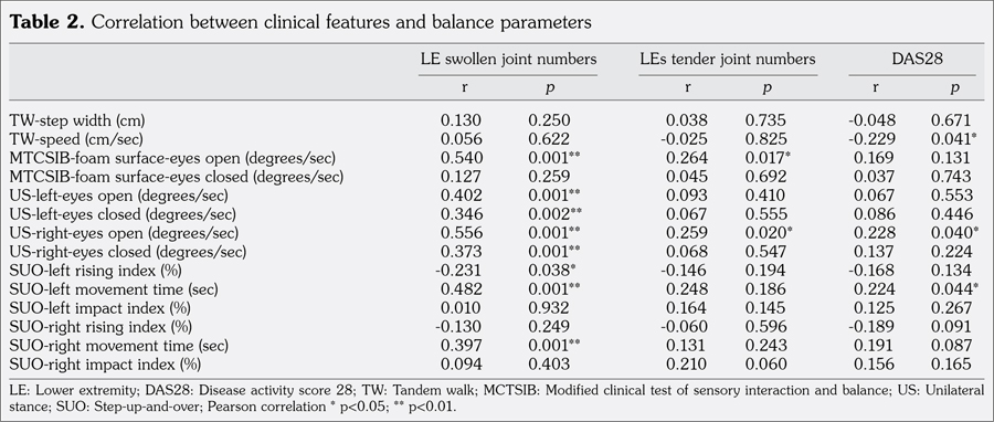 Results: Rheumatoid arthritis patients had significantly higher sway velocity in unilateral stance and modified clinical test of sensory interaction and balance tests, higher step width and lower speed when walking on a line, lower rising index and higher movement time in step-up-and-over test compared to healthy controls (p<0.05). Performances on the sit-to-stand and weight bearing squat tests were comparable between both groups. Of the patients, although 61% had hallux valgus, 52% had metatarsus primus varus, 33% had pes planus, and 26% had splaying foot, these deformities were not correlated with Foot and Ankle Outcome Score or balance disorders. Presence of swollen joint was determined as the most relevant factor for balance disorders of RA patients.