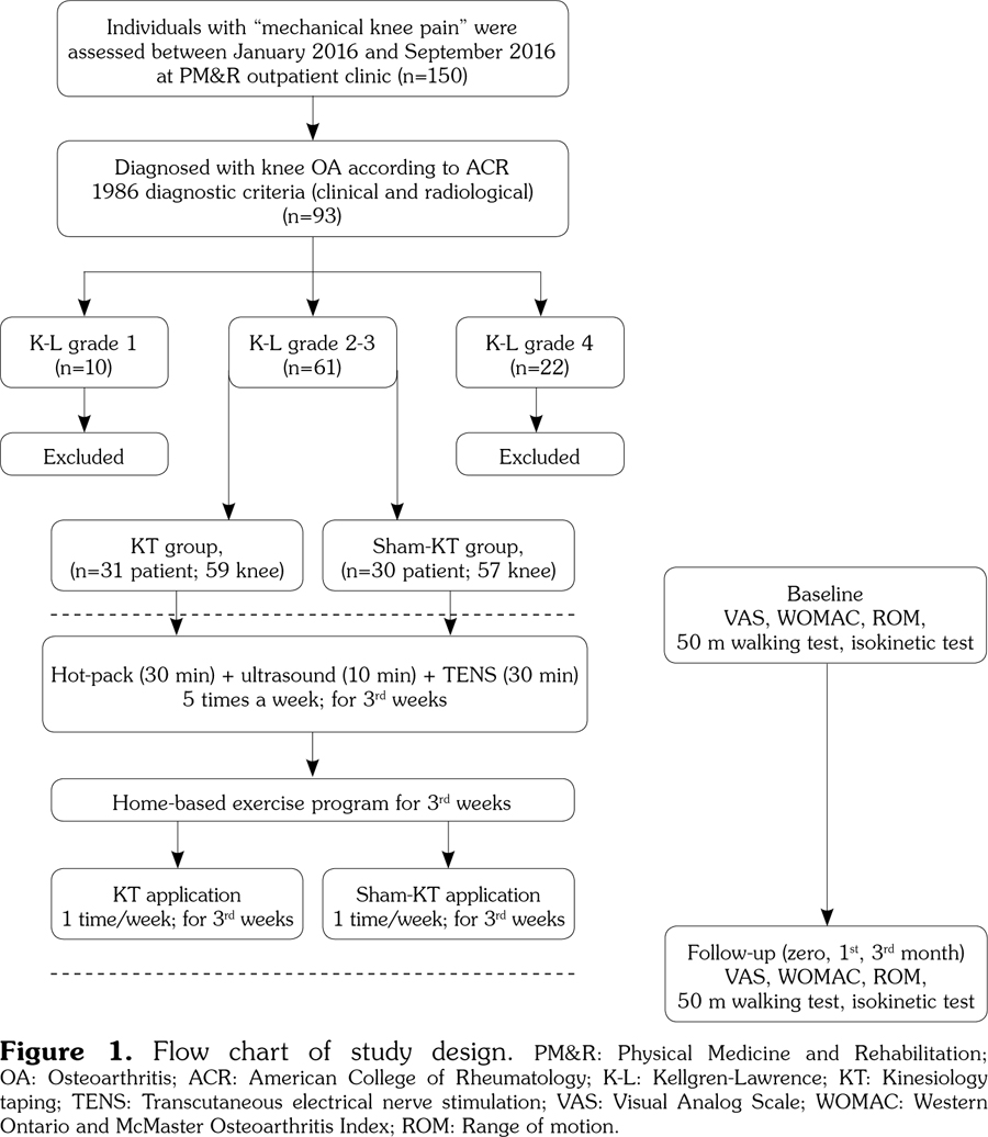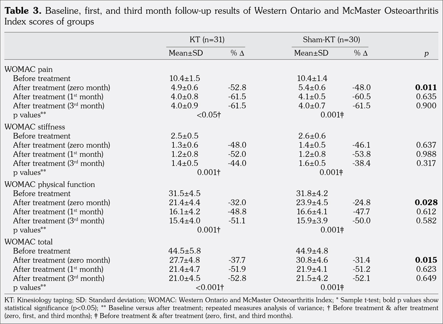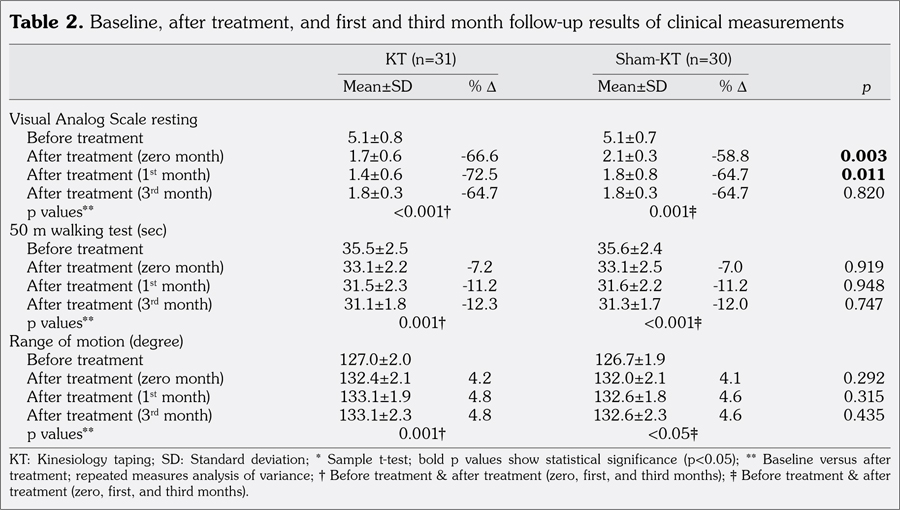 Patients and methods: The study included 61 female patients (mean age 53.5±3.5 years; range 50 to 60 years) who were admitted to Physical Medicine and Rehabilitation Outpatient Clinic with complaints of mechanical knee pain. Knee osteoarthritis was diagnosed according to the clinical/ radiological criteria of the American College of Rheumatology and patients with Kellgren-Lawrence grade 2 and 3 were included. Patients were randomly divided into two groups. Both groups received transcutaneous electrical nerve stimulation for 30 minutes, hot pack for 30 minutes, and therapeutic ultrasound for 10 minutes in a day for three weeks (five days in a week). Also, one group was treated with KT (KT group, n=31) while the other group was treated with sham-KT (sham-KT group, n=30) one time a week for three weeks. A home program of around the knee strengthening exercises was recommended for all patients. All patients were evaluated with visual analog scale, Western Ontario and McMaster Osteoarthritis Index (WOMAC) values, goniometric measurement of active knee range of motion, 50-meter walking distance, and isokinetic knee extensor muscle peak torque measurements before treatment, at the end of treatment, and at one month and three months after treatment.