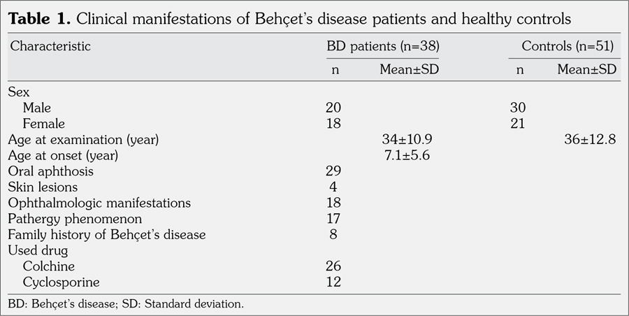 The study included 38 Turkish patients with BD (20 males, 18 females; mean age 34±10.9 years) who fulfilled the International Study Group diagnostic criteria for BD and 51 healthy controls (30 males, 21 females; mean age 36±12.8 years) enrolled at the outpatient clinic of BD, the Department of Dermatology and Department of Ophthalmology between June 2011 and June 2012. The mean duration of disease was 7.1 years (range, 1-20 years). We questioned the positive family history of patients. We performed tissue typing for the unrelated controls, who had been previously enrolled to our laboratory for volunteer bone marrow donation. Controls were questioned about their previous autoinflammatory or inflammatory immunediseases.Itiswell-knownthatallpatients and controls are not genetically related to each other. The clinical data of all study participants were recorded. The study protocol was approved by the Atatürk University Faculty of Medicine Ethics Committee. A written informed consent was obtained from each patient and control. The study was conducted in accordance with the principles of the Declaration of Helsinki.