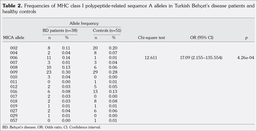 Results: A total of 16 MICA alleles were found in BD patients as well as in control subjects. The gene frequency of MICA*006 was significantly higher in the BD patients compared to controls (14.5% vs. 0.9%; odds ratio [OR]: 17.092 95% confidence interval [CI] [2.155~135.554]; p<0.05). When haplotypes were evaluated, an association was found between the haplotypes HLA-B*51-MICA*006 (11.8% and 0.9%; OR: 13.567 95% CI [1.679~109.577]; p<0.001) and HLA-B*51-MICA*009 (27.6% and 13.7%; OR: 2.4 95% CI [1.127~5.109]; p<0.05). Frequencies of HLA-B*49-MICA*004 (0% and 6.8%) and HLA-B*52- MICA*009 (0% and 10.7%) were significantly higher in controls compared to BD patients (p<0.05).