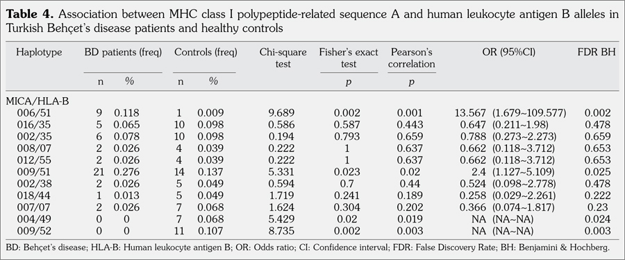 When haplotypes were evaluated, there was a relationship between the haplotype HLA-B*51-MICA*006 (11.8% and 0.9%; OR: 13.567 95% CI [1.679~109.577]; p<0.001) and HLA-B*51-MICA*009 (27.6% and 13.7%; OR: 2.4 95% CI [1.127~5.109]; p<0.05. The relative value of LD of this haplotype for patient and control groups was 0.84 and R(2)=0.06. HLA-B*49-MICA*004 (0% and 6.8%) and HLA-B*52-MICA*009 (0% and 10.7%) frequencies were significantly higher in controls compared to patients (p<0.05) (Table 4).