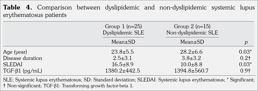 Patients and methods: The study included 40 female SLE patients (mean age 25.5±6.2 years; range 15 to 39 years) diagnosed according to the American College of Rheumatology criteria and 30 female healthy controls (mean age 26.2±5.9 years; range 16 to 39 years). Disease activity was assessed using SLE Disease Activity Index. Patients were diagnosed with lupus nephritis if they met the criteria for renal disorder. SLE patients and controls were compared in terms of TGF-β1, low and high density lipoprotein, and triglyceride levels.