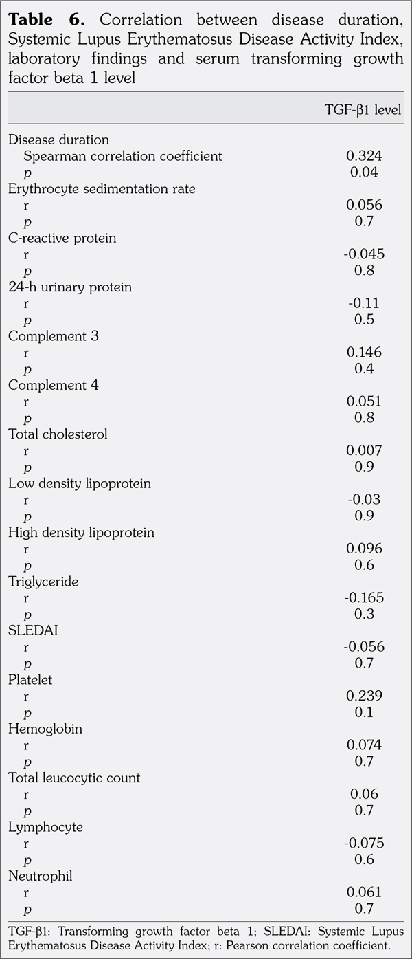 Results: Mean serum TGF-β1 level of patients with SLE was 1385.7±483.1 pg/mL, with a significant difference compared to control group (2079.6±125.4 pg/mL; p<0.001). TGF-β1 was statistically significantly correlated with SLE disease duration. However, there was no statistically significant correlation between TGF-β1 and erythrocyte sedimentation rate, C-reactive protein, 24-hour urinary protein, complement 3, serum cholesterol, low density lipoprotein, or serum triglyceride. TGF-β1 was statistically significantly correlated with discoid rash. There was a statistically significant correlation between SLE Disease Activity Index and serum cholesterol, and triglyceride.