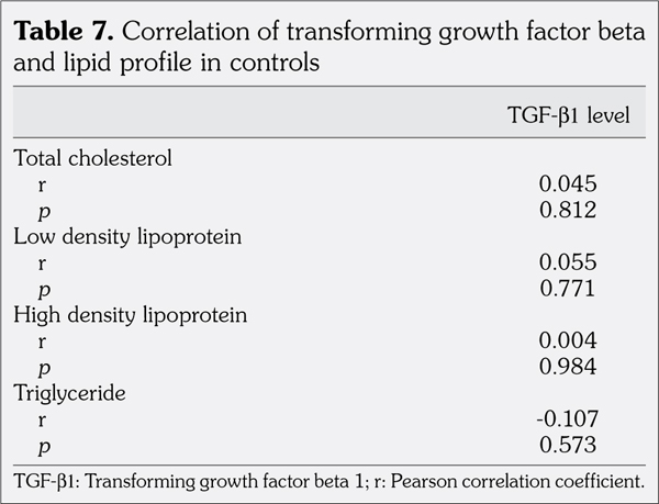 Transforming growth factor-beta 1 was not statistically significantly correlated with serum cholesterol, triglyceride, or LDL levels in the control group (p>0.05) (Table 10). There was no statistically significant difference in TGF-β1 level between patients with high or low disease activity, between those with proteinuria of >3 g or <3 g, and between those with serum creatinine of >1.2 g/dL or <1.2 g/dL (Table 11, 12, 13).