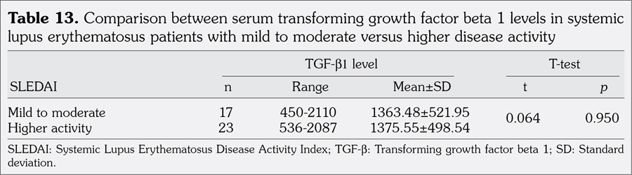 Furthermore, we divided our SLE patients into different subgroups according to their SLEDAI score. Accordingly, the number of patients with mild to moderate SLEDAI scores was 17 (42.5%), while the number of patients with high SLEDAI scores was 23 (57.5%). A comparison of the serum levels of TGF-β1 in SLE patients as regards to their SLEDAI score revealed no statistically significant difference between serum TGF-β1 levels in patients with mild to moderate SLEDAI scores and patients with high SLEDAI scores (p=0.950). This finding disagreed with findings of Jin et al.,(20) who found that total TGF-β1 levels were lower in patients with high disease activity. This may be due to their larger sample size.