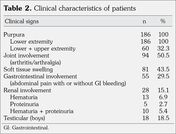 Patients and methods: The data of 186 patients (97 boys, 89 girls; mean age 7.4±2.8 years; range 1.5 to 16.5 years) who were followed-up with the diagnosis of Henoch-Schönlein purpura in our clinic between October 2011 and December 2013 were evaluated retrospectively.