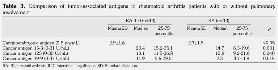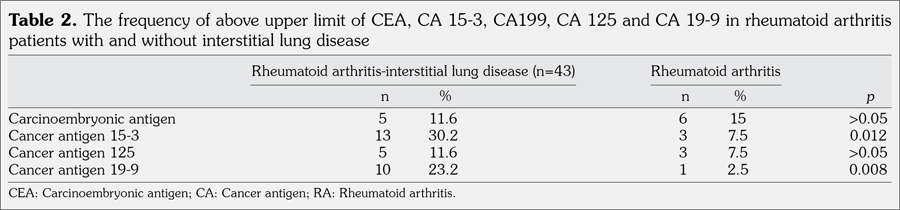 Results: Five RA patients (11.6%) with ILD had carcinoembryonic antigen levels above the upper limit. The numbers of RA-ILD patients with above the upper limit of CA 19-9, CA 15-3, and CA 125 levels were 10 (23.2%), 13 (30.2%), and five (11.6%), respectively. Rates of RA patients without ILD with tumor-associated antigens exceeding the upper limit were 15% for carcinoembryonic antigen, 2.5% for CA 19-9, 7.5% for CA 15-3, and 7.5% for CA 125. No evidence of any malignancy was detected by medical history, physical examination, and laboratory and imaging methods in patients who had high levels of serum tumor-associated antigen. CA 15-3 (p=0.001), CA 125 (p=0.040), and CA 19-9 (p=0.018) levels were statistically significantly different in RA patients with ILD compared to those without ILD. Rheumatoid factor, anti-cyclic citrullinated peptide, and tumor-associated antigens were higher in RA patients with ILD than those without ILD.