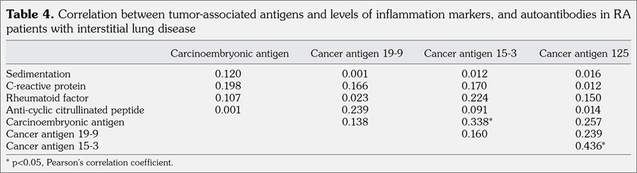 A limitation of our study was that we did not evaluate the changes of TAAs levels in RA patients on the follow-up. In another retrospective study, RA patients were analyzed according to the presence or absence of ILD.(21) There was no significant difference for RF, anti-CCP positivity, or acute phase reactants between both groups. It was found that RA-ILD patients had increased tumor markers such as CA 15-3 and CA 125 and decreased of total lung capacity, inspiratory capacity, and DLCO. There was no statistically significant difference between smoking rate, sedimentation, CRP, RF, or anti-CCP levels in RA patients with or without pulmonary involvement (Table 1).