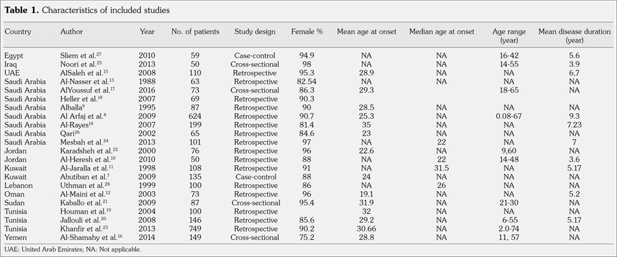 We reviewed the full text articles of 39 studies. Seventeen studies were excluded (five sample sizes with lower than 50 participants, five involved one organ system, three genetic studies, one outcome study, one involved 50% non-Arab ethnicities, one incidence and prevalence study, and one intensive care unit admission). Twenty-two articles(7-28) from 11 countries including 3,273 patients (349 males, 2,924 females; mean age 28.9 years) met the inclusion criteria and were analyzed (Table 1). The study design was retrospective in 16 studies, cross-sectional in four studies and case-control in two studies.