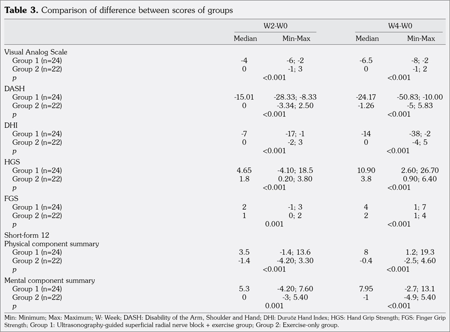 Patients and methods: In this prospective, randomized and controlled single-blind study, 50 female patients (mean age 59.0±5.1 years; range, 46 to 64 years) diagnosed with hand osteoarthritis were randomized into two groups. Group 1 (n=25) was administered an ultrasound-guided superficial branch of the radial nerve injection (with a combination of 2 mL 0.25% bupivacaine and 1 mL methylprednisolone acetate) + exercise, while group 2 (n=25) only exercised. Patients were assessed with a visual analog scale for pain, hand grip strength, finger grip strength, Quick Disability of the Arm, Shoulder and Hand questionnaire, Duruöz Hand Index and Short-form 12. Data were obtained before treatment (W0), in the second week after treatment (W2) and in the fourth week after treatment (W4).