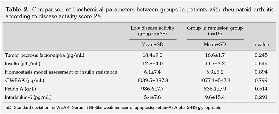 Patients and methods: Fifty-four patients with RA (8 males, 46 females; mean age 52 years; range 40 to 64 years) and 34 healthy controls (6 males, 28 females; mean age 53 years; range 41 to 65 years) were included in the study. The sTWEAK, fetuin-A, insulin, lipid profile and IL-6 concentrations were determined. The HOMA-IR levels were calculated using a calculator. Disease activity score 28 was used to assess the disease activity.