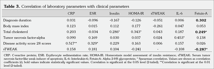 Correlations of the laboratory parameters with some demographic characteristics and clinical parameters are shown in Table 3. A significant positive correlation was found between the IL-6 concentrations and TNF-α (r=0.453, p=0.001). Significant correlations were detected of fetuin-A concentration with disease duration and total cholesterol (positive) and with sTWEAK (negative).
