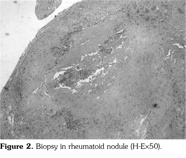 Accelerated nodulosis was first described by Kremer and Lee in 1986 as increased number of nodules in three patients with long-term use of MTX.(6) Since that time, several reports were published indicating that accelerated nodulosis was seen at rates of 8-11% in patients with RA taking MTX.(4) Subcutaneous nodules may develop at a mean of three years after the start of MTX treatment.(7) HLA-DRB1*0401 and RF positivity are related to MTX-induced accelerated nodulosis.(3,8) There have been occasional reports of accelerated nodulosis associated with other disease modifying antirheumatic drugs other than MTX, such as leflunomide, azathioprine and anti- TNF drugs, particularly etanercept.(2,4,5) Newly emerged rheumatoid nodules mainly affect the hands, particularly the metacarpophalangeal and proximal interphalangeal joints. While MTX- induced accelerated nodulosis affects the hands at a rate of 88%, non-accelerated nodulosis affects the hands at a rate of 34%.(3,8,9) Compared to classic rheumatoid nodules, accelerated nodules have more rapid onset and growth, are smaller and follow a different distribution (hand, foot, and ear).(3) Accelerated nodules generally develop while there is low disease activity. Histopathologically, they are not different from rheumatoid nodules. They develop in three zones; internally mononuclear cells surrounding fibrinoid necrosis while externally there is granulomatous inflammation.(6,10) The pathogenesis of drug-related nodulosis is not clear. Increased giant cell formation with A1 receptor stimulation and adenosine production stimulated from the monocytes by MTX could be effective in the pathogenesis and it is theorized that drugs which inhibit adenosine A1 receptor could be useful in MTX-induced accelerated nodulosis.(11) The rheumatoid synovial membrane and rheumatoid nodules are histologically similar. Still, there are some differences. Unlike in the synovium, there are no B cells, plasma cells or organized lymphoid structures in rheumatoid nodules. In addition, E-selectin expression is higher in the blood vessels of rheumatoid nodules than in the synovium. Wikaningrum et al.(12) determined that interleukin-1 beta (IL-1β) was elevated in rheumatoid nodules and not in the synovium. Furthermore, the TNF-alpha (α) level was found to be high in the synovium and low in rheumatoid nodules. Cunnane et al.(2) reported three cases of seropositive arthritis who developed nail bed infarcts and an increased number of nodules two-three months after starting etanercept treatment. It was thought that vasculitis, treatment-related cell death and increased chemotaxis could be responsible in the formation of nodules. Mackley et al.(13) reported a seropositive RA patient who developed nodules on the hands one year after starting infliximab treatment. There is no proven treatment for accelerated rheumatoid nodulosis; therefore, it is wise to stop the offending drug. Various drugs have been attempted for the treatment of accelerated nodulosis,(14) most commonly hydroxychloroquine, colchicine, D-penicillamine, and sulfasalazine.(15-18) Cases of pulmonary nodules were reported that improved with tocilizumab and rituximab.(19,20) Several cases of severe subcutaneous nodulosis treated with rituximab were also reported.(21) In our patient, nodulosis started with the use of MTX first and even increased with further use of etanercept and leflunomide. Contrary to the reports in the literature, after withdrawal from drugs, neither the size nor the number of nodules decreased in our patient. Use of colchicine had a subtle effect and hydroxychloroquine had no effect. The development of nodulosis in our patient during a period of low disease activity was consistent with the literature. The patient being seropositive and having a history of smoking were risk factors for nodulosis, particularly for MTX- induced accelerated nodulosis. HLA-DRB1*0401 positivity was not evaluated in our patient as this evaluation is not available in routine practice at our hospital.