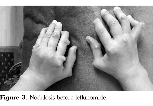 Rheumatoid arthritis (RA) is a progressive, systemic inflammatory disease with articular and extra-articular involvement. The skin is the most common location of extra-articular involvement and subcutaneous nodules are seen in 25% of RA patients. These are granulomatous nodules below the skin, often seen in extensor areas under external pressure and they may also be seen in the elbow(1) They were also reported in the lungs, the heart and the meniscus.(2) Compared to rheumatoid nodules, accelerated nodules have a more rapid onset and growth, are smaller and follow a different distribution (hand, foot, and ear).(3) Accelerated nodules can be seen with methotrexate (MTX), anti-tumor necrosis factor (anti-TNF) drugs and occasionally with leflunomide and azathioprine treatment.(4,5) The case presented here is a patient with RA who developed accelerated nodulosis with the use of MTX that exacerbated with the later use of etanercept and leflunomide.