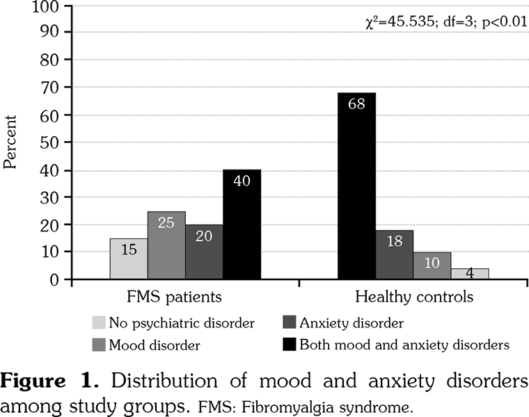 The rate of patients diagnosed with any mood or anxiety disorder using SCID-I was significantly higher in FMS group (85%) compared to healthy control group (32%) (p<0.01). The distribution of psychiatric comorbidity in general is shown in Figure 1. While major depressive disorder (42.6%) was the most common psychiatric diagnosis in females with FMS, the percentage of patients with post-traumatic stress disorder was also quite high (14.7%). The distribution of mood and anxiety disorders among study groups is presented in Table 2.
