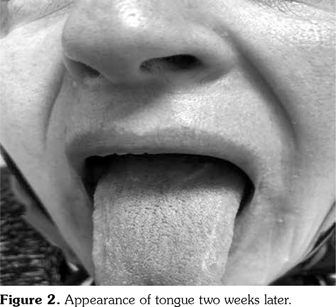 Education of patients who are at risk for developing BHT is the first-line treatment of BTH.(5) Discontinuation of offending drugs, altering predisposing factors, and maintaining good oral hygiene are needed in treatment. Gentle debridement of tongue with a soft toothbrush leads to desquamation of the hyperkeratotic papillae.(2,5) Oral and topical retinoids can be used as part of second-line treatment.(16,17) In our patient, hairy tongue resolved after debridement of tongue with a soft toothbrush and discontinuation of prednisolone.