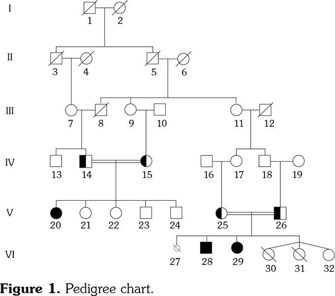 The clinical features of both siblings exhibited chronic osteomyelitis and CDA, which were consistent with the diagnosis of MS. The family history revealed a second degree cousin who was diagnosed with MS during the infancy period (Figure 1, #20), a case that we had previously published.(6) Genetic studies were requested for both patients and their mother. The father’s deoxyribonucleic acid (DNA) sample was not available.