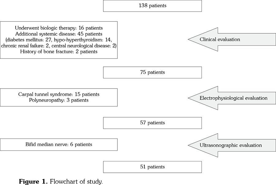 A total of 138 patients with a diagnosis of established RA at Ankara Training and Research Hospital Rheumatology Outpatient Clinic between March 2017 and August 2018 were initially evaluated. Exclusion criteria were high disease activity according to disease activity score 28 (DAS28, using erythrocyte sedimentation rate [ESR]), undergoing biological therapy, having a history of trauma to the upper extremity, and the presence of central or peripheral neurological diseases, electroneuromyography (ENMG)-proven CTS, radiculopathy or any other neuropathy, pregnancy or any systemic disease that might cause swelling on nerves (e.g., diabetes mellitus, renal failure, and thyroid disease), US-detected bifid or trifid median nerve, persistent median artery, or space-occupying lesions at the carpal-tunnel. Of the 138 RA patients, 51 (12 males, 39 females; mean age 50.9±8.9 years; range, 18 to 65 years) who met the specified criteria and were followed-up at the rheumatology outpatient clinic for at least six months were included in the study (Figure 1). The study protocol was approved by the Ankara Numune Training and Research Hospital Ethics Committee (number of approval: E-17-1619). A written informed consent was obtained from each patient. The study was conducted in accordance with the principles of the Declaration of Helsinki.