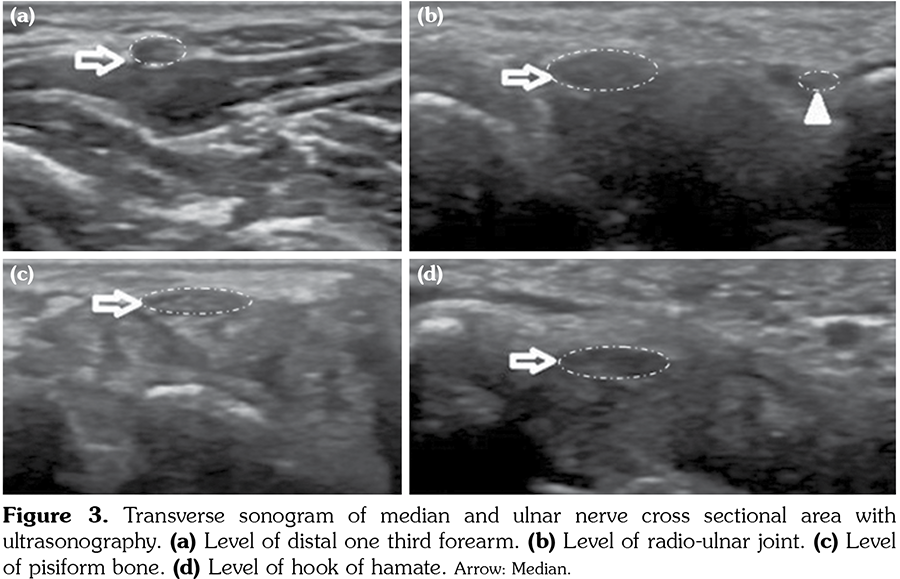 Nerve US was performed by the same clinician with five years of experience in this area. All the US evaluations were performed with a 7-12 MHz (General Electric, LOGIQ P5, Oklahoma City, USA) linear array probe with the patient in a supine position. The nerves were viewed in the axial plane. The transducer was kept perpendicular to the nerve. The median nerve CSAs were measured at the distal one third of the forearm, hook of hamate, pisiform bone, and radio-ulnar joint. The ulnar nerve CSA was measured at the level of the pisiform bone.[3] The CSA measurements were undertaken by tracing the nerve just inside its hyperechoic rim (Figure 3). Three different measurements were obtained and the average of the three was used for each level.