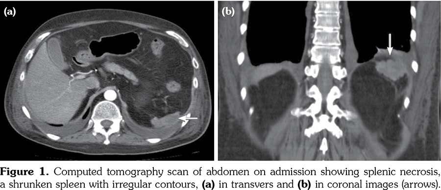 Because the risk of infections with encapsulated bacteria increases with splenic necrosis and immunosuppressive treatment further increases this risk,[15] our patient was administered pneumococcal vaccine.