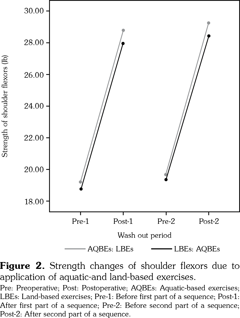 There was a significant improvement of shoulder flexors’ strength (F 3,4=130, p<0.001; Wilks’ Λ=0.025, partial η2=0.975) in both AQBEs and LBEs groups. However, there was no statistical significance (p>0.05) that suggested the superiority of one type of exercise over the other (Figure 2). The strength of shoulder abductors behaved similarly in both types of treatment (F 3,4=52.6, p<0.001; Wilks’ Λ=0.06, partial η2=0.940) with no superiority of one treatment (p>0.05) (Figure 3).