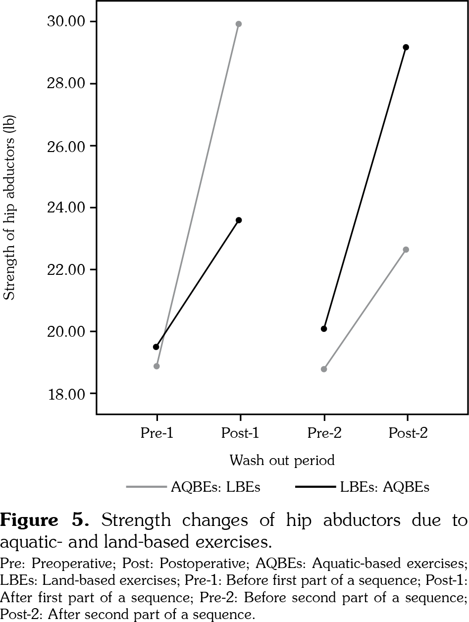 The strength of hip flexors improved significantly in both AQBEs and LBEs groups (F 3,4=138.2, p<0.001; Wilks’ Λ=0.01, partial η2=0.990) but with a preference for the AQBEs (32±2.1 lb) over LBEs (25.1±4.3 lb) (p=0.007) (Figure 4). As for the hip abductors, there was a significant increase in strength after the application of AQBEs and LBEs (F 3,4=51.4, p=0.001; Wilks’ Λ=0.025, partial η2=0.975); however, the strength of hip abductors (31.4±2.2 lb) increased significantly by AQBEs compared with LBEs (23.9±4.8 lb) (p=0.012) (Figure 5). The sequence of treatment which the children followed did not affect significantly the strength of hip flexors (F 1,6=0.012, p=0.915; Wilks’ Λ=0.998, partial η2=0.002) and hip abductors (F 1,6=0.311, p=0.597; Wilks’ Λ=0.951, partial η2=0.049).