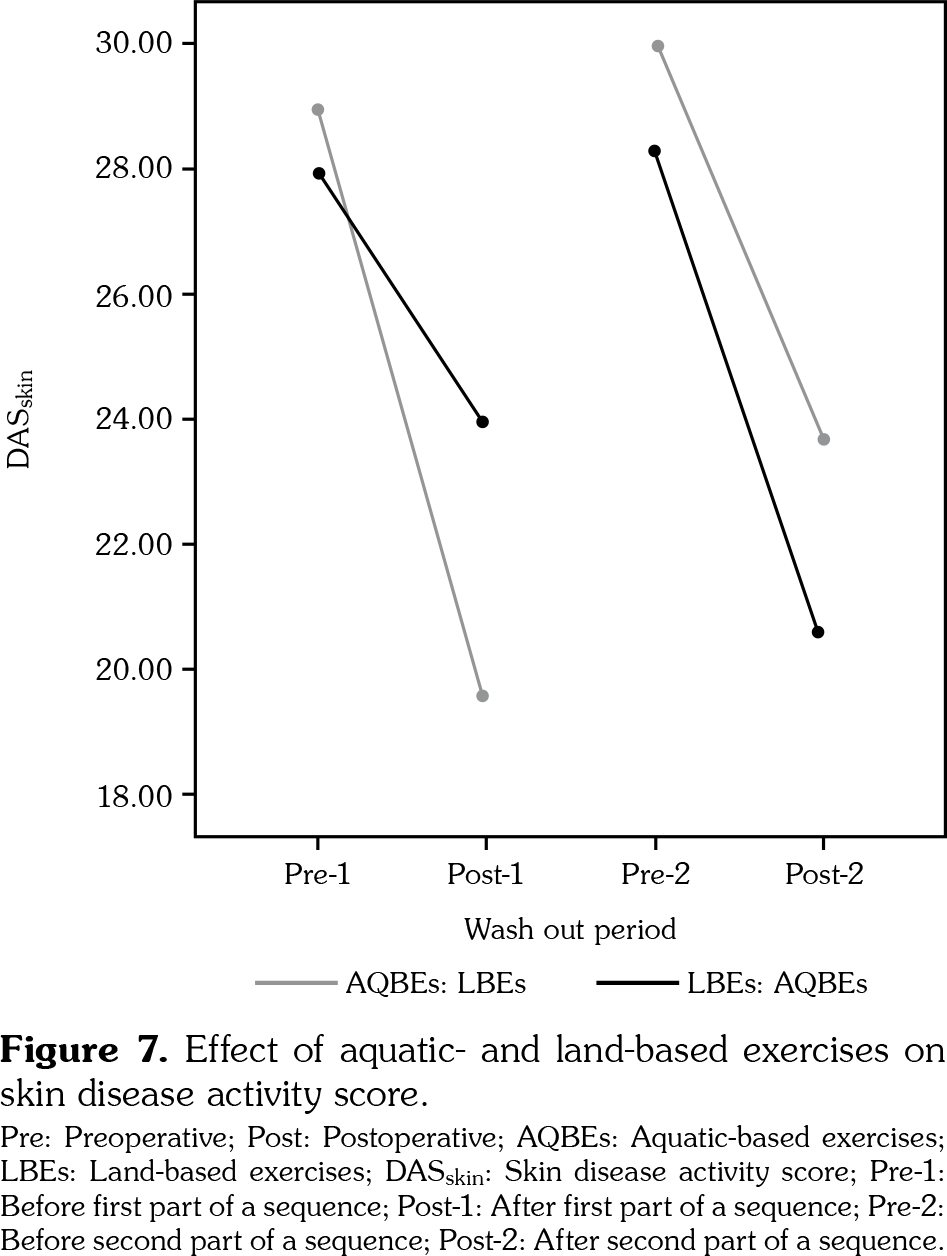 Although both types of treatments enhanced the overall disease activity significantly (F 3,4=236.9, p<0.001; Wilks’ Λ=0.006, partial η2=0.994), AQBEs program showed a marked advantage over LBEs in terms of DASskin (2.8±1.3, 4.35±1.8, respectively) (p=0.011) (Figure 7). There was no significant influence of the treatment sequence on DASskin (F 1,6=0.06, p=0.822; Wilks’ Λ=0.991, partial η2=0.01).