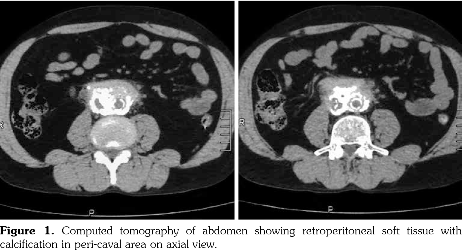 On investigations, his complete blood count was normal. Erythrocyte sedimentation rate was 88 mm in first hour. Random blood sugar was 93 mg/dL. His serum urea was 26 mg/dL and serum creatinine was 1.1 mg/dL. Liver function tests were within normal limits. Chest X-ray revealed non-homogenous opacities in bilateral lung fields. Pulmonary function tests revealed forced expiratory volume in one second (FEV1) of 61% and forced vital capacity (FVC) of 73%. FEV1/FVC ratio was 84%. Two-dimensional echocardiography was within normal limits. Ultrasonography of the abdomen revealed small-sized right kidney (6.9x2.9 cm) with dilated pelvi-calyceal system and dilated proximal ureter. Computed tomography (CT) of the abdomen revealed medial deviation of right ureter and presence of retroperitoneal soft tissue along infra-renal aorta and peri-caval area with calcification extending up to iliac vessels suggestive of RPF (Figures 1, 2, 3, and 4). High-resolution CT of the chest confirmed presence of interstitial lung disease (ILD). ANA profile (ENA) revealed that anti-U1 snRNP was strongly positive. Rest of the autoantibodies were negative. His serum immunoglobulin G levels were within normal limits. Thus, we arrived at a diagnosis of MCTD with RPF and ILD. He was started on mycophenolate 720 mg twice daily, hydroxychloroquine 200 mg once daily and deflazacort 6 mg once daily for MCTD, pirfenidone 400 mg twice daily for ILD and tamoxifen 20 mg once daily for RPF. On follow-up at six months, he was doing physically well. His symptoms of cough were reduced and dyspnea improved from NYHA class IV to class II. Repeat pulmonary function tests revealed FEV1 of 59%, FVC of 71% and FEV1/FVC ratio of 84%. However, repeat ultrasonography of the abdomen did not reveal any significant change in pelvi- calyceal system.