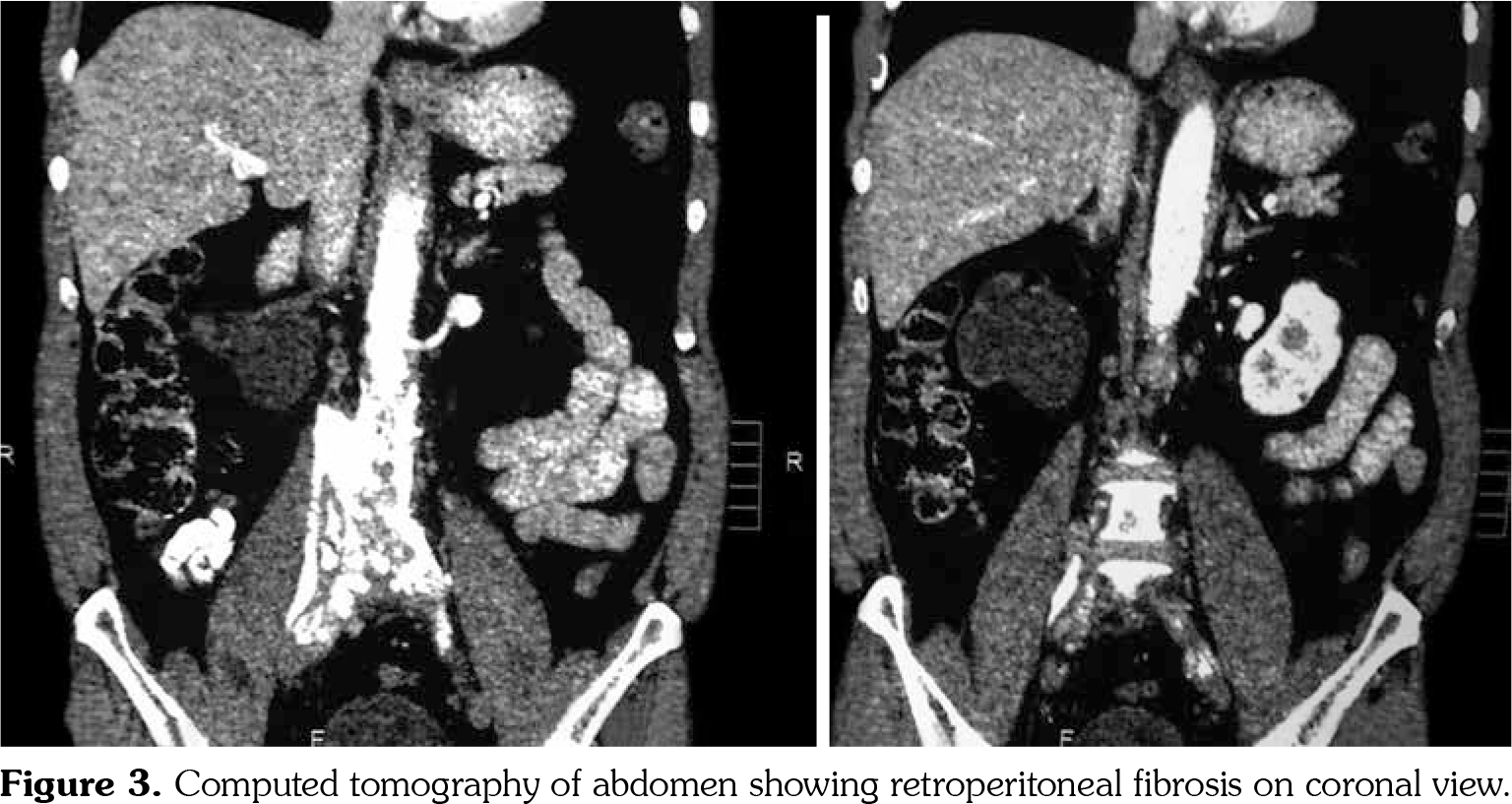 In 1972, Sharp et al.,[1] recorded a group of patients who had clinical features of SLE, SSc and PM with high titers of anti-extractable nuclear antigen antibody. They published it as a new disease entity: MCTD. Since then, there has been an increasing number of classification criteria published for the diagnosis of MCTD, namely, Kasukawa et al.[3] Alarcon-Segovia and Villareal[4] and Kahn and Appelboom.[5] There has been no consensus on clinical features owing to varied manifestations and frequent overlap of symptoms with other autoimmune conditions. However, high titers of antibodies against U1 snRNP have been found in most patients.[6] Our patient had symptoms of dysphagia, epistaxis and ocular sicca coupled with high titers of anti-U1 snRNP which led us to the diagnosis of MCTD. He also had pulmonary involvement in the form of ILD. One study showed 47% of cases of MCTD to have ILD.[7] The most frequent histological picture seen is non-specific interstitial pneumonia, followed by usual interstitial pneumonia and lymphocytic interstitial pneumonia.[8] RPF was first reported by Ormond[9] in 1948. It is a rare condition characterized by inflammation and fibrosis of the retroperitoneum, around the infra-renal portion of abdominal aorta and iliac arteries and usually entraps ureters and inferior vena cava.[10] A recent study reported incidence of RPF around 1.3 per 100,000 population per year in Netherlands.[11] The mean age of presentation is around 50 years with male predominance (2:1-3:1). Abdominal CT and magnetic resonance imaging are the investigations of choice for the diagnosis of RPF and they reveal a homogenous mass near the lower abdominal aorta and iliac arteries that surround and displace the ureters medially. Medical therapies for RPF include steroids, tamoxifen, other immunosuppresives such as azathioprine, mycophenolate and anti-CD20 antibody such as rituximab. In one single-center prospective observational study of 55 patients with RPF treated with tamoxifen monotherapy for a minimum of two years, 47 (85%) patients reported substantial resolution of symptoms after a median treatment duration of three weeks. There was a mass regression in 39 (71%) patients at four months and 47 (85%) patients at eight months of follow-up, respectively. Recurrence- free survival in patients with treatment success after post-treatment follow-up of 21 months was 68%.[12] To our knowledge, there is no previously published case report on presence of RPF in a patient of MCTD. This is indeed a rare occurrence.