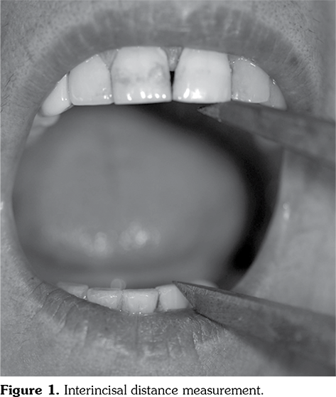 Patients were referred to the Faculty of Dentistry for the interincisal distance (ID) measurement. An experienced dentist performed the dental examination of this study. The maximal mouth opening capacity (MOC) was measured using the ID between the maxillary and mandibular central incisors in the midline as described by Wood and Branco.[19] Before measuring MOC, the subjects were asked to rest in the visiting area for at least 10 minutes. MOC was measured for each subject in the Frankfort horizontal plane (a line from the tragus of the ear through the palpable bony infraorbital rim area), which was oriented parallel to the floor, according to the natural head position in a dental unit. The subjects were asked to open their mouths as wide as they could with no pain. The linear distance from the incisal edge of the upper central incisor to the incisal edge of the lower central incisor was recorded using a dental bow compass and measured with a millimeter ruler. Each subject was measured three times every two minutes and the highest value of these three measurements was recorded (Figure 1).[20]