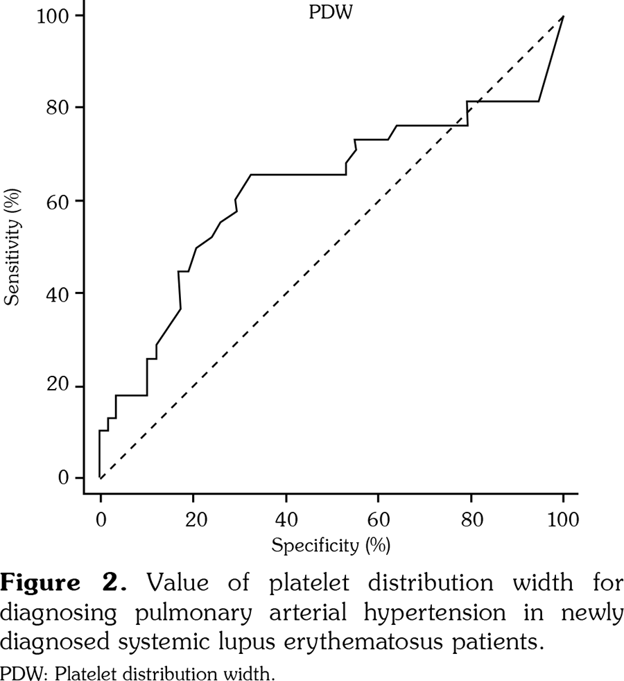 Results: The PDW level was higher in the SLE-PAH group than that in the SLE-non-PAH group (p=0.023). SLE patients were allocated into high systemic lupus erythematosus disease activity index (SLEDAI) group (SLEDAI score, ≥10) (n=121) or low SLEDAI group (SLEDAI score, <10) (n=113). The PDW level was significantly higher in the high SLEDAI group than that in the low SLEDAI group (p=0.030). The receiver operating characteristic curve was used to evaluate the clinical value of the PDW level in diagnosing PAH in SLE patients. The PDW level was valuable for diagnosing PAH in SLE patients [area under the curve (AUC)=0.591, p=0.023]. The optimal critical value of the PDW level was 14.55 fL. Under these conditions, the sensitivity, specificity, and Youden index were 57%, 63% and 0.20, respectively. For newly diagnosed patients, the PDW level had good diagnostic accuracy, with an AUC of 0.626 (p=0.037). The optimal critical value of the PDW level was 14.65 fL. Under these conditions, the sensitivity, specificity, and Youden index were 66%, 67% and 0.33, respectively.