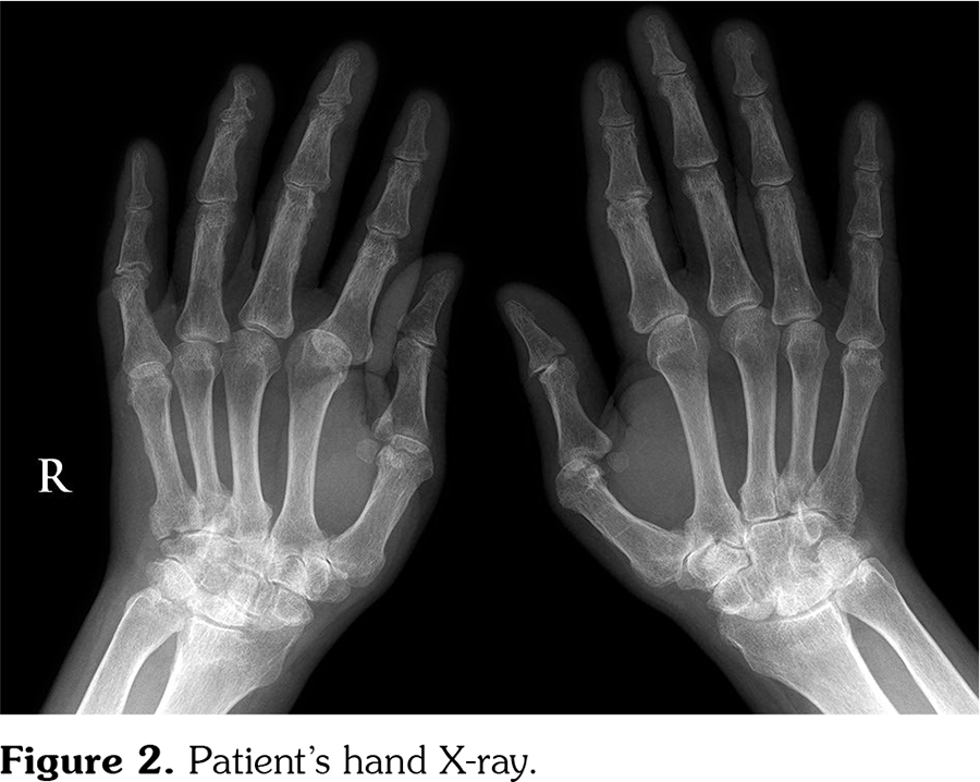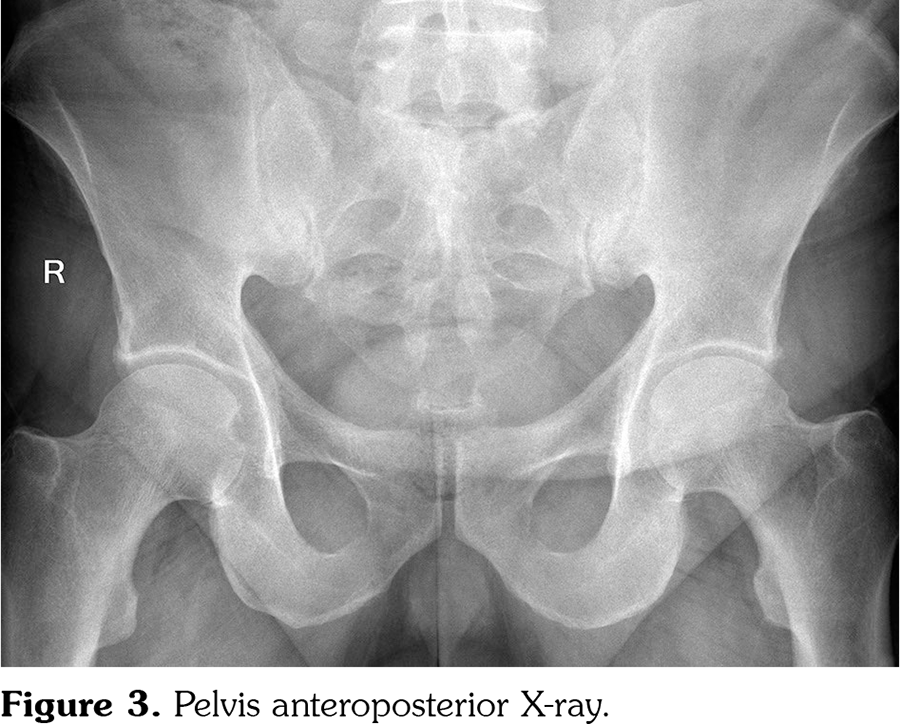 A 45-year-old male patient with RA was referred for newly onset skin rashes on his arms and legs after starting the treatment with tofacitinib (Figure 1). He was taking methotrexate 5 mg/weekly, folic acid 5 mg/weekly and tofacitinib 5 mg twice a day for RA. Disease had started nine years ago, first with pain and swallowing on his ankle. Within one year, arthritis developed on wrist, metacarpophalangeal (MCP) and proximal interphalangeal (PIP) joints, with no involvement in distal interphalangeal (DIP) joints. The patient had no inflammatory back pain symptoms. Psoriasis was not present in his or his family’s medical history. Laboratory tests were negative for antinuclear antibody, extractable nuclear antigen profile, anti-cyclic citrullinated peptide, rheumatoid factor and human leukocyte antigen B27. Erythrocyte sedimentation rate was 26 mm/hour and C-reactive protein was 12.6 mg/L (0-5 mg/L). There were bilateral ulnar styloid erosions, carpal erosions and osteopenia on his hand X-ray; marginal erosions on fifth MCP, second MCP, third PIP joint, subluxation on second MCP joint on right hand; joint erosion and subluxation of first MCP, erosion and joint space narrowing of second PIP joint on left hand (Figure 2). DIP joints were normal on both hands except two osteophytes. On his pelvis anteroposterior X-ray, sacroiliac joint spaces were normal (Figure 3). Patient’s type of joint involvement and radiological findings were consistent with RA but not psoriatic arthritis. In this course, he had used methotrexate, sulfasalazine, leflunomide, hydroxychloroquine and glucocorticoids at different times. Because of the ineffectiveness of the conventional synthetic disease-modifying anti-rheumatic drugs, etanercept was started. Then, etanercept induced skin rashes with unknown characteristics and was stopped subsequently. After improving of the skin rashes, rituximab was started but discontinued due to the ineffectiveness. Tofacitinib was started when his disease activity was high (disease activity score-28 [DAS28] >5.1). Skin rashes appeared on the third month of the tofacitinib therapy while disease activity was low (DAS28=2.8). We consulted the dermatology. Dermatological examination revealed multiple, clearly demarcated, silvery, squamous and erythematous papules and plaques on the arms, legs, and ankles. Skin biopsy was performed. Epidermal parakeratosis, hyperkeratosis, focal hypogranulosis, and acanthosis with elongation of the rete ridges were observed in the skin biopsy. He was diagnosed with psoriasis. We decided that tofacitinib induced psoriasiform lesions, so tofacitinib was discontinued and leflunomide was started. After two months, lesions were improved. A written informed consent was obtained from the patient.