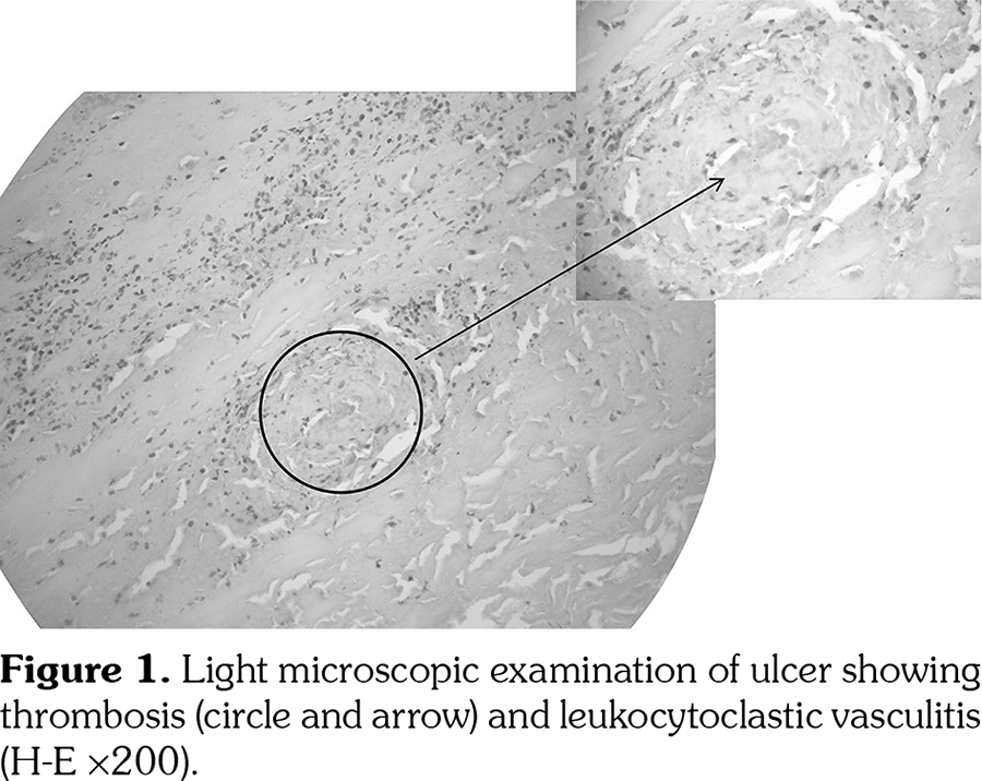 In May 2007, the patient developed painful ulcers in her right leg with the subsequent formation of a large necrotic eschar. An escharotomy was performed and its anatomopathological findings showed thrombosis and leukocytoclastic vasculitis (Figure 1).