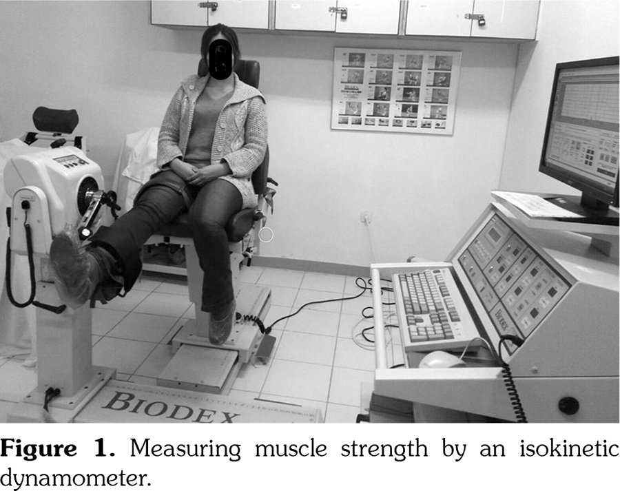 This study was conducted at Cumhuriyet University Faculty of Medicine between August 2013 and January 2014. The number of subjects was determined to be 30 to provide 80% of the research power. Thirty-two females with FMF (median age 27.50 years; range, 18 to 50 years) and 30 healthy females (median age 32 years; range, 18 to 50 years) were included in the study. Participants (i) <18 years old and >50 years old, (ii) without written consents, (iii) with chronic diseases and rheumatologic diseases other than FMF, (iv) who used corticosteroid within last year, (v) FMF patients who had malnutrition according to nutrition evaluation test, (vi) FMF patients who had disease duration of less than one year and (vii) those with acute episode were excluded. Patients were chosen and classified according to Tel-Hashomer criteria.[6] Demographic data including age, occupation, smoking, duration after first diagnosis, delay time before first diagnosis, family history, dose of colchicines, and response to colchicines therapy (complete response: with no episode, incomplete response: >50% decrease of the frequency of the episodes, no response: <50% decrease of the frequency of the episodes or any response), frequency of the episodes (in a month), additional medications and accompanying diseases were recorded.[7] Symptom severity was scored by Tel-Hashomer and gene analysis for the mutation of MEFV was recorded.[8] Circumference of arm, waist, and thigh was recorded in centimeters. Body mass index (BMI, in kg/m2 and classified as slim, normal, overweight or obese) was calculated to evaluate the obesity while rate of the circumference of the waist to the thigh (WTR) was calculated to evaluate the central obesity. Both measures are frequently used to evaluate cardiovascular risks.[9] Short form 36 (SF-36) for quality of life (QoL) and Multidimensional Assessment of Fatigue (MAF) scale were applied to both groups.[10,11] Mass of skeletal muscles was measured with dual X-ray absorption (DXA with Hologic QDR 4500 W, Bedford, MA, USA) and mass of fat, muscle, and bone (for total body, and for arm, leg, and trunk separately) were recorded. Participants with a composition of fat less than 29% were accepted as cachexia.[12] Muscle strength was measured from the dominant knee with an isokinetic dynamometer (Biodex Medical Systems, Shirley N.Y. 11967, USA). Peak torque value of flexion at the velocity of 60°/second, peak torque value of extension at the velocity of 60°/second, the value of total work during flexion at the velocity of 240°/second and value of total work during extension at the velocity of 240°/second were recorded (Figure 1). Strength of hand grip was measured from dominant hand with hand dynamometer (Saehan hydraulic hand dynamometer model SH5001, Masan, Korea). C-reactive protein (CRP, mg/L), erythrocyte sedimentation rate (ESR, mm/hour), fibrinogen (mg/dL) and serum creatinine kinase (CK, U/L) levels were recorded. The study protocol was approved by the Cumhuriyet University Faculty of Medicine Ethics Committee. A written informed consent was obtained from each participant. The study was conducted in accordance with the principles of the Declaration of Helsinki.